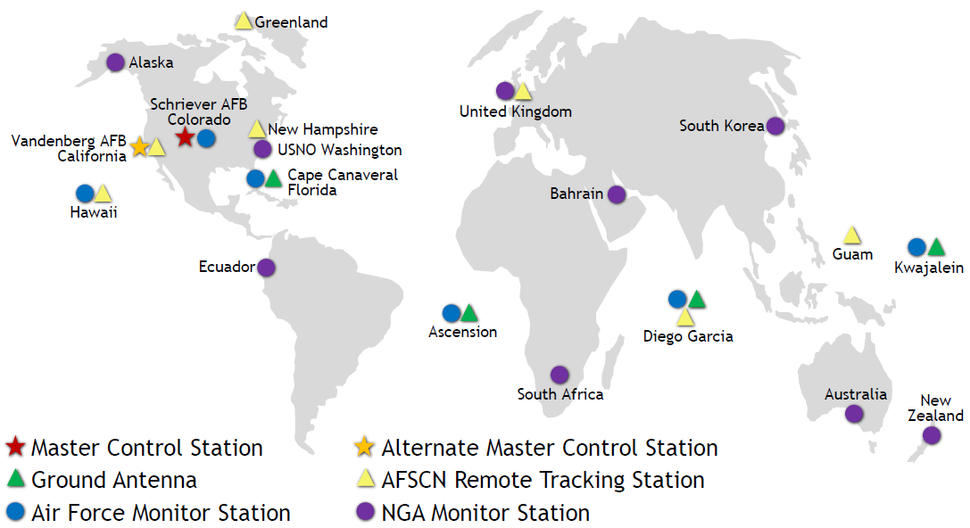 Sistema mundial de navegación por satélite establecido por los Estados Unidos de América. La constelación básica del GPS consta de 24 posiciones, distribuidas uniformemente en seis planos orbitales. Tres de esas posiciones son extensibles y pueden ser ocupadas por un máximo de dos satélites. Los satélites que no se encuentran en una posición definida de la constelación del GPS ocupan otros sectores de los seis planos orbitales. Los parámetros orbitales y los segmentos asignados de referencia de la constelación a contar de la época definida se establecen en la cuarta edición de las especificaciones de funcionamiento del servicio uniforme de localización (Standard Positioning Service Performance Specification) del GPS, de septiembre de 2008. En esa fecha, la constelación del GPS tenía 30 satélites activos que transmitían señales de navegación limpias, 11 en el Bloque IIA, 12 en el Bloque IIR y 7 en el Bloque IIR-M. |