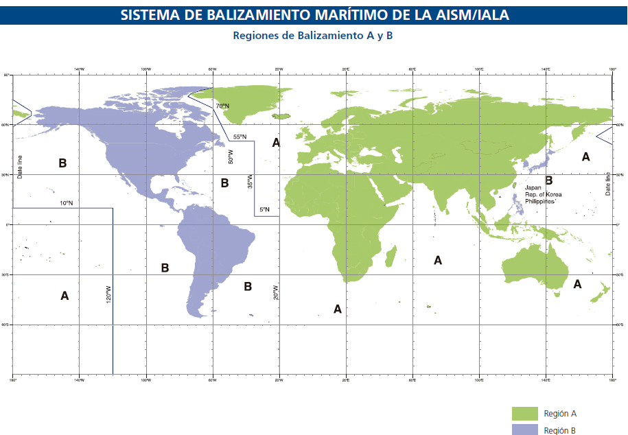 | Sistema de Boyado Marítimo IALA para la navegación - Regiones de Boyado A y B |