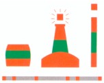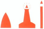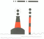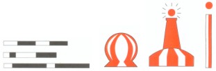 Colores: franjas verticales rojas y blancas. Marca de tope (cuando se use): esfera roja. Luz: blanca isofasica de ocultación (destello largo c/10 s) o letra Morse "A" (.-) |