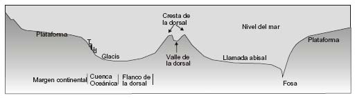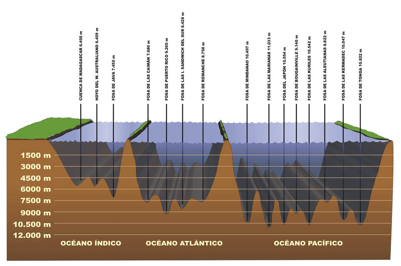 El fondo de los mares es muy accidentado. Existen mesetas, cordilleras y profundas depresiones.