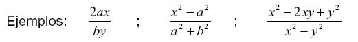 Es el cociente indicado de dos expresiones algebraicas, donde al dividendo se le denomina numerador y al divisor se le denomina denominador.