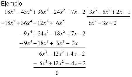 Siendo D(x), dividendo y d(x) el divisor, es la operación que tiene por objeto hallar otro polinomio denominador cociente c(x), de tal modo que se verifique que D(x) = d(x)·c(x) + r(x) siendo r(x) otro polinomio resto, cuyo grado es menor que el grado del divisor.