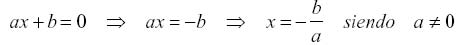Es toda ecuación de la forma ax+b=0, donde se observa que sólo hay una incógnita y que el máximo grado de ésta es uno. La resolución de toda ecuación de primer grado consiste en aplicar las propiedades anteriormente indicadas hasta reducirla a esta forma y despejar la incógnita.