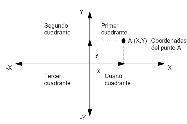 Un punto cualquiera del plano A se puede fijar como una distancia x sobre el eje horizontal (abcisa) y otra distancia sobre el eje vertical (ordenada). A este par de valores se denomina coordenadas de A y se expresa A(x,y) o simplemente (x,y).