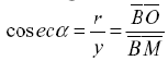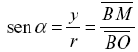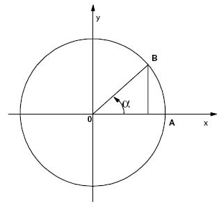 Sea el ángulo AOB, cuya medida es α. Si colocamos un sistema de coordenadas cartesianas cuyo origen sea el centro de la circunferencia, podemos hacer las siguientes definiciones: