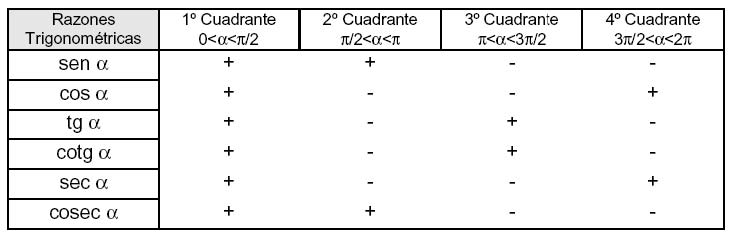 El signo dependerá del que tenga la correspondiente abscisa y ordenada, según se refleja en el siguiente cuadro: