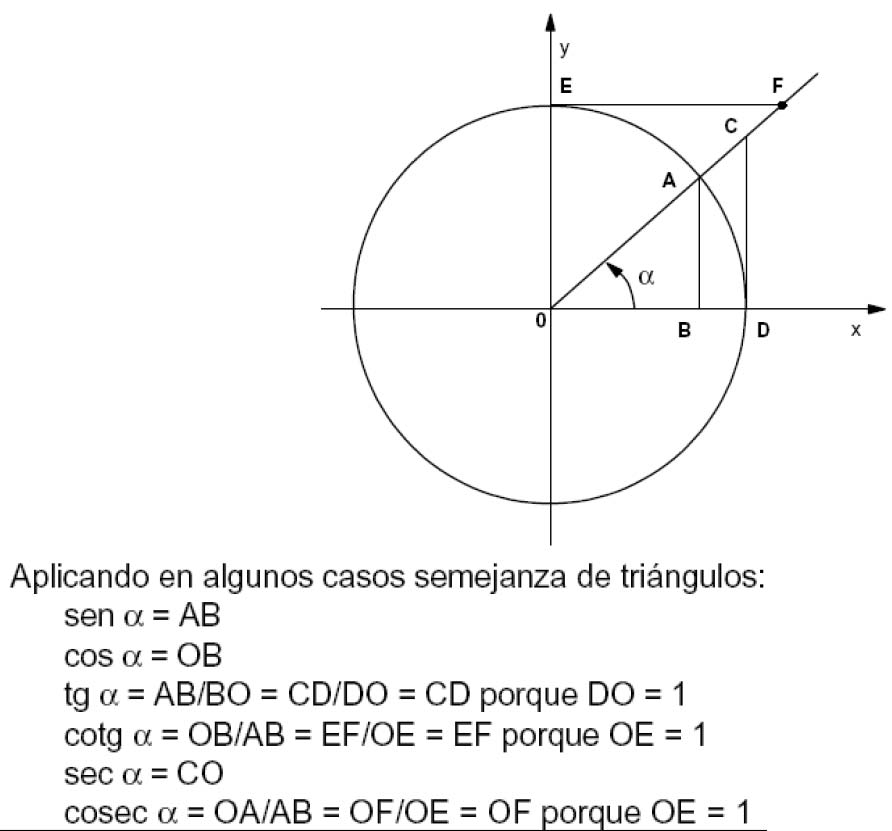 Si aplicamos todo lo anterior a un ángulo, considerando el arco cuyo radio es la unidad, las razones reciben en este caso particular el nombre de líneas trigonométricas.