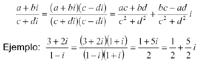 Para dividir dos números complejos se multiplican numerador y denominador por el conjugado del denominador, para eliminar el factor i del denominador.