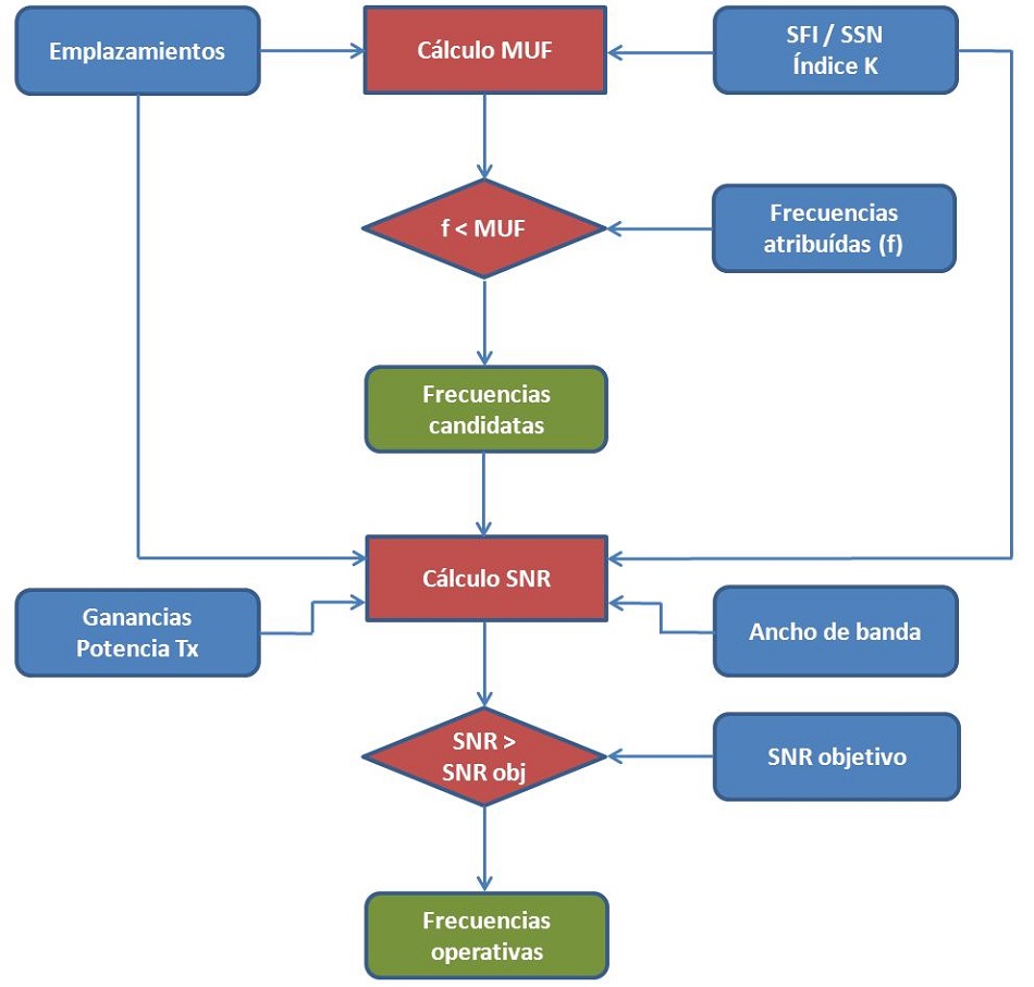 Una posible metodología de planificación de frecuencias para enlaces radio en la banda de HF tiene las siguientes fases (ver figura):