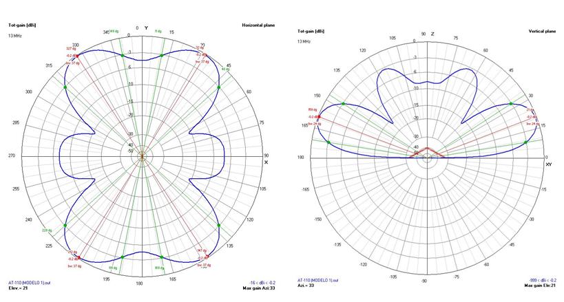 Diagramas de radiación horizontal y vertical teóricos en 13 MHz de una antena AT-110 sobre mástil de 12 m, calculados con el programa 4Nec2.